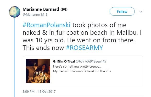 Η Μαριάν Μπάρναρντ μάλιστα είχε καταγγείλει και μέσω Twitter πως ο σκηνοθέτης της επιτέθηκε σεξουαλικά, όταν ήταν μόλις δέκα ετών.