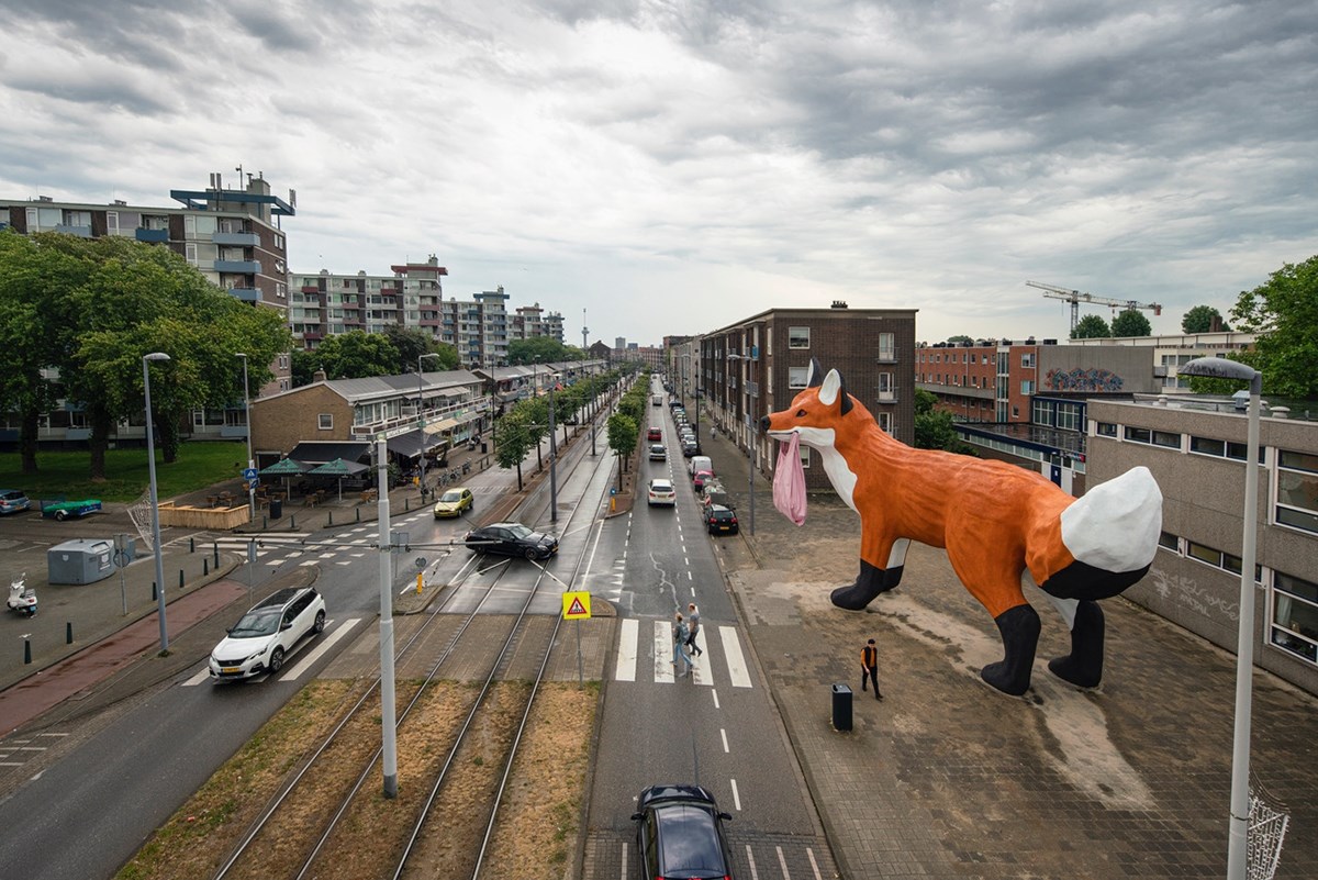 Πολύ συχνά εντοπίζουν αλεπούδες να περιφέρονται στους δρόμους τη νύχτα οι κάτοικοι της συνοικίας Bospolder-Tussendijken στο Ρότερνταμ της Ολλανδίας. Τώρα, ο Ολλανδός καλλιτέχνης Florentijn Hofman έδωσε σε μία από αυτές ένα μόνιμο σπίτι: εγκατέστησε την «Bospolder Fox», με μια ροζ πλαστική σακούλα στα σαγόνια της, να εποπτεύει ένα πολυσύχναστο σταυροδρόμι της συνοικίας. Και μοιάζει να ρωτά: «Κάτι έχει κλέψει; Μαζεύει τα σκουπίδια; Ή, μόλις επέστρεψε από ένα αγοραστικό ξεφάντωμα;»