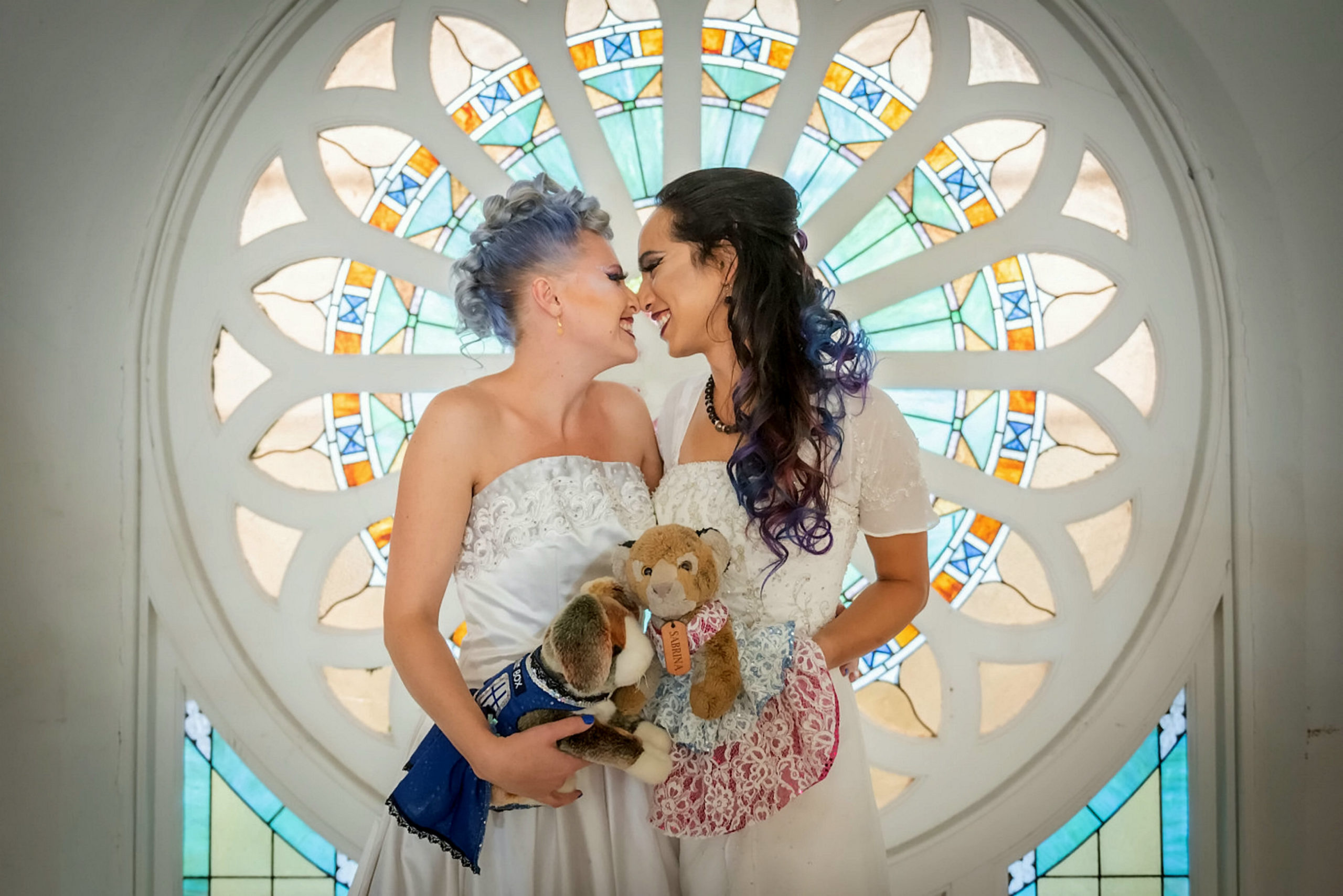 Ο γάμος έγινε στο Ιλινόις των ΗΠΑ και οι δύο νύφες πρωτοτύπησαν αν και δυσαρεστήθηκαν που το ένα φόρεμα κάηκε γρηγορότερα από το άλλο.