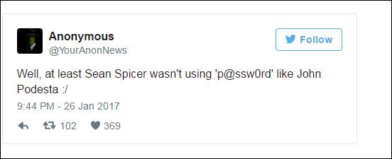 Το περιστατικό σχολίασαν και οι Anonymous που τον συνέκριναν με τον John Podesta, επικεφαλής της εκστρατείας της Χίλαρι Κλίντον, λέγοντας πως τουλάχιστον ο Sean Spicer δεν χρησιμοποιεί τόσο συνηθισμένους κωδικούς πρόσβασης.