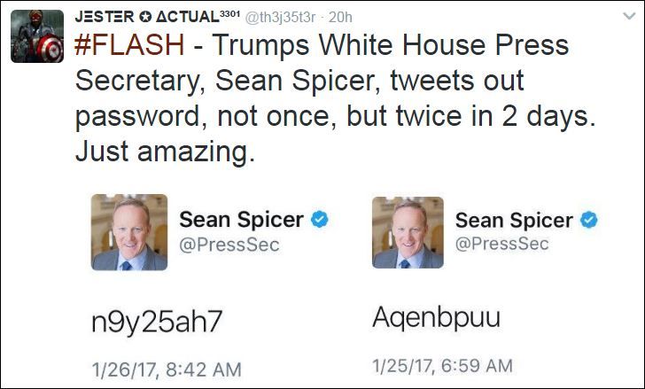 Ο χάκερ The Jester ανακάλυψε ότι ο Sean Spicer έγραψε δύο διαφορετικούς κωδικούς πρόσβασης δύο συνεχόμενες μέρες στον λογαριασμό του.