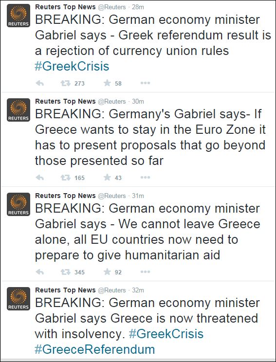 Ο Γκάμπριελ τόνισε ότι “εάν η Ελλάδα θέλει να παραμείνει στην Ευρωζώνη πρέπει να υποβάλει προτάσεις που υπερβαίνουν εκείνες που είχαν παρουσιαστεί μέχρι τώρα” και πρόσθεσε: “Το αποτέλεσμα του ελληνικού δημοψηφίσματος είναι η απόρριψη των κανόνων της νομισματικής ένωσης”.