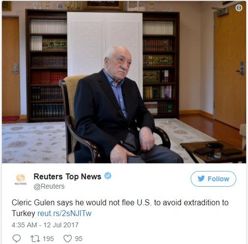 Ο Φετουλάχ Γκιουλέν, ο αυτοεξόεριστος στις ΗΠΑ ιμάμης, τον οποίο ο Ερντογάν θεωρεί ενορχηστρωτή του περυσινού αποτυχημένου πραξικοπήματος, διαμηνύει πως δεν σκοπεύει να εγκαταλείψει τις ΗΠΑ και ότι θα αποδεχθεί ενδεχόμενη έκδοσή του στην Τουρκία στην περίπτωση που η Ουάσινγκτον συμφωνήσει με την Άγκυρα να τον παραδώσει.