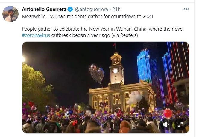 Βέβαια οι χρήστες του twitter έσπευσαν να σχολιάσουν τις εικόνες συνωστισμού ότι ενώ ο πλανήτης γιορτάζει την Πρωτοχρονιά από την ασφάλεια και τον περιορισμό του σπιτιού του, οι κάτοικοι της Γουχάν είναι οι μόνοι που μπορούν να γιορτάσουν ελεύθερα.