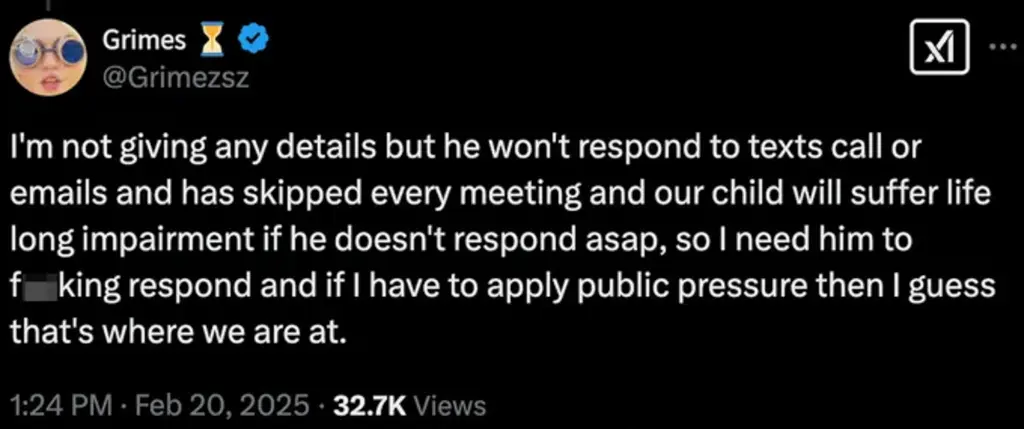 Η 36χρονη Grimes, χρησιμοποίησε την πλατφόρμα X του Μασκ, ζητώντας από τον συνιδρυτή της Tesla να απαντήσει στα μηνύματα, τις κλήσεις και τα e-mails που του έστειλε σχετικά με μια «ιατρική κρίση» που αντιμετωπίζει ένα από τα τρία παιδιά τους.