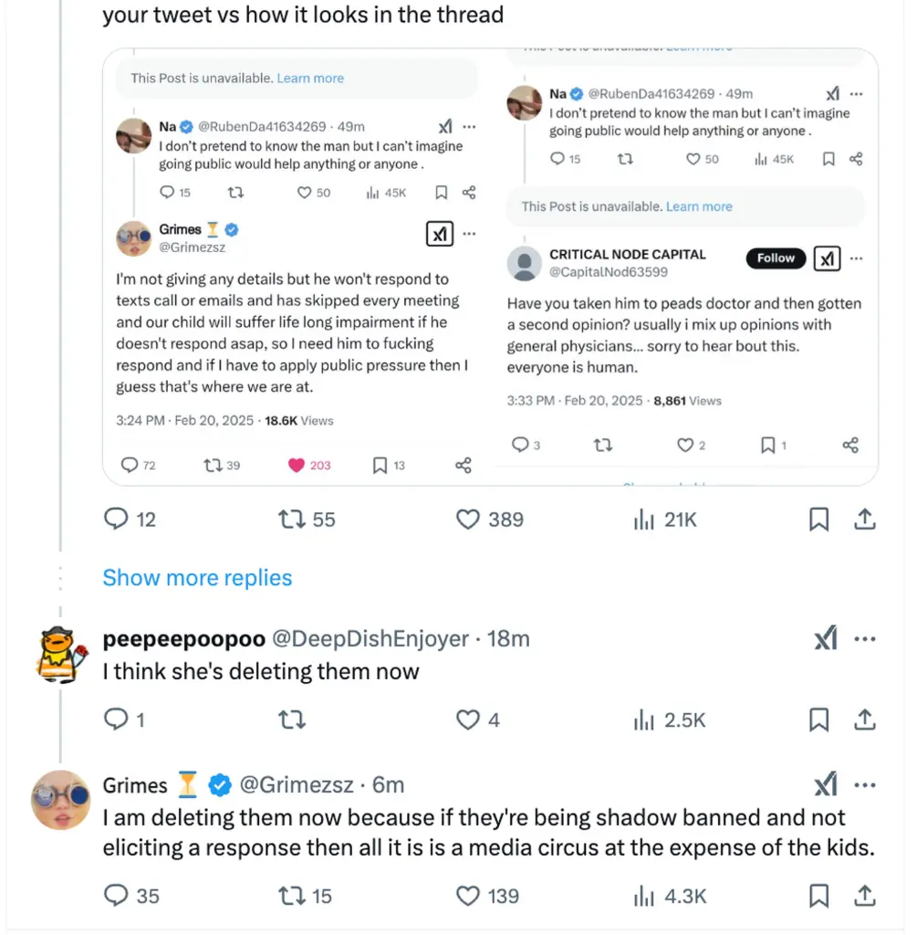 Όταν ένας χρήστης αντέτεινε ότι η δημοσιοποίηση της κατάστασης δεν θα βοηθήσει, η Grimes υπογράμμισε τη σοβαρότητα της κατάστασης, λέγοντας ότι το παιδί τους μπορεί να υποστεί «μακροχρόνιες βλάβες».