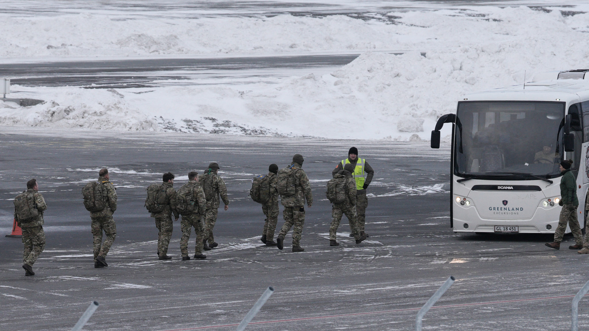 Military personnel believed to be from the German armed Forces Bundeswehr make their way to a bus after disembarking a charter plane upon arrival at Nuuk international airport on January 16, 2026 in Nuuk, Greenland. Denmark's prime minister said on January 15, 2026 that the US ambition to take control of Greenland remained "intact" and that there were still a "fundamental disagreement" between the countries, despite high-stakes White House talks. (Photo by Alessandro Rampazzo / AFP) / ALTERNATIVE CROP