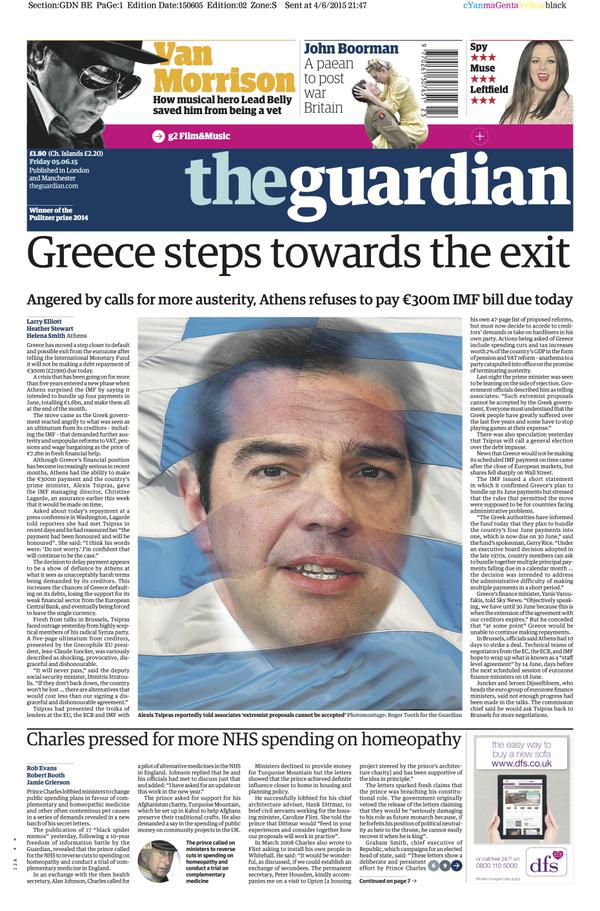 Στο εξώφυλλο του Guardian βρίσκεται το θέμα της Ελλάδας με τίτλο «Η Ελλάδα ένα βήμα πριν την έξοδο».