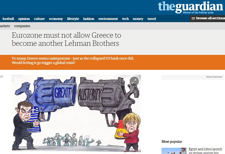 «Η Ευρωζώνη δεν πρέπει να επιτρέψει στην Ελλάδα να γίνει μία ακόμα Lehman Brothers», είναι ο τίτλος της βρετανικής εφημερίδας Guardian που αναφέρεται στις διαπραγματεύσεις Ελλάδας-Ευρωζώνης.