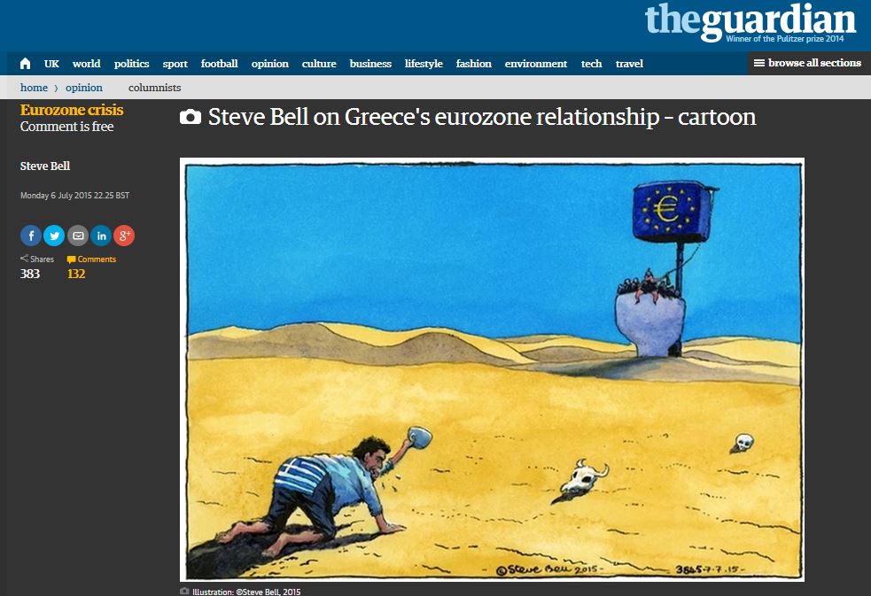 Στο σκίτσο του, δείχνει έναν Έλληνα να σέρνεται παρακαλώντας για λίγο νερό, με μία κούπα στο χέρι, ενώ κατευθύνεται προς το… καζανάκι της ευρωζώνης.