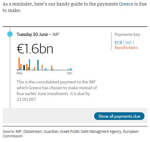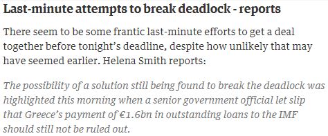 Ένας ανώτερος κυβερνητικός αξιωματούχος από την Ελλάδα άφησε να διαρρεύσει ότι η αποπληρωμή του πακέτου των δόσεων Ιουνίου ύψους 1,6 δισ. ευρώ προς το ΔΝΤ δεν μπορεί να αποκλειστεί ακόμα καθώς λήγει σήμερα η προθεσμία.