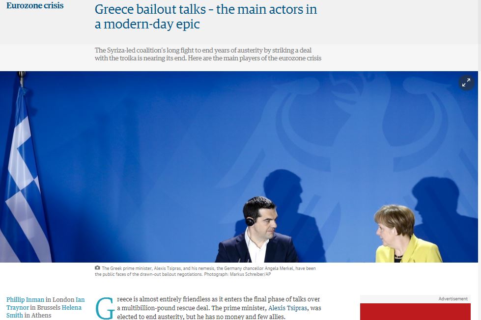 Τo ελληνικό δράμα, τα σκηνικά, οι πρωταγωνιστές, οι δεύτεροι ρόλοι, οι κομπάρσοι, το μακικιάζ, παρουσιάζει ο Guardian ως θεατρικό έργο στη διαδικασία της διαπραγμάτευσης.