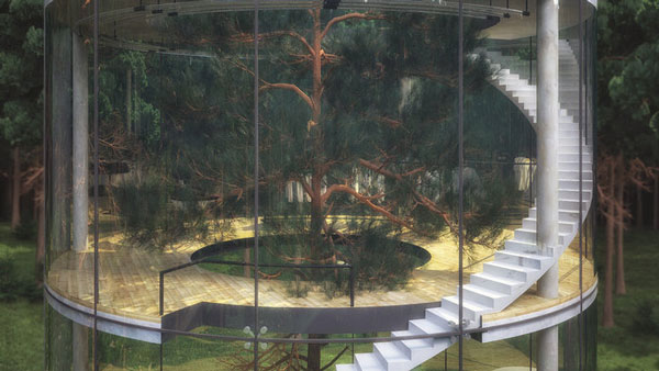 Δεν έχει τοίχους, μοιάζει με έναν τεράστιο κύλινδρο που δεσπόζει στο κέντρο ενός δάσους, ενώ με μια πιο προσεκτική ματιά ο θεατής αντιλαμβάνεται ότι η δομή αγκαλιάζεται στο εσωτερικό της από ένα δέντρο, που αναπτύσσεται στους ορόφους του με τρόπο φυσικό.