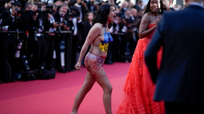 Αναστάτωση προκλήθηκε σήμερα στο κόκκινο χαλί του Κινηματογραφικού Φεστιβάλ των Καννών, όταν εμφανίστηκε μια γυμνή ακτιβίστρια που θέλησε να αποδοκιμάσει τη ρωσική εισβολή στην Ουκρανία, και χρειάστηκε η επέμβαση των ανδρών ασφαλείας για την απομάκρυνσή της.