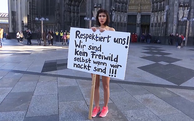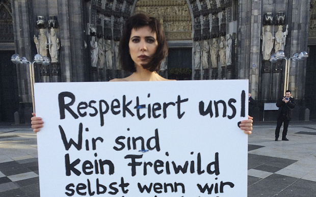 H Ελβετίδα καλλιτέχνιδα Μιλό Μουαρέ πραγματοποίησε σήμερα μια γυμνή διαμαρτυρία μπροστά από τον καθεδρικό ναό της Κολωνίας στη Γερμανία για να καταγγείλει τις σεξουαλικές επιθέσεις που διαπράχθηκαν εναντίον γυναικών τη νύχτα της Πρωτοχρονιάς.