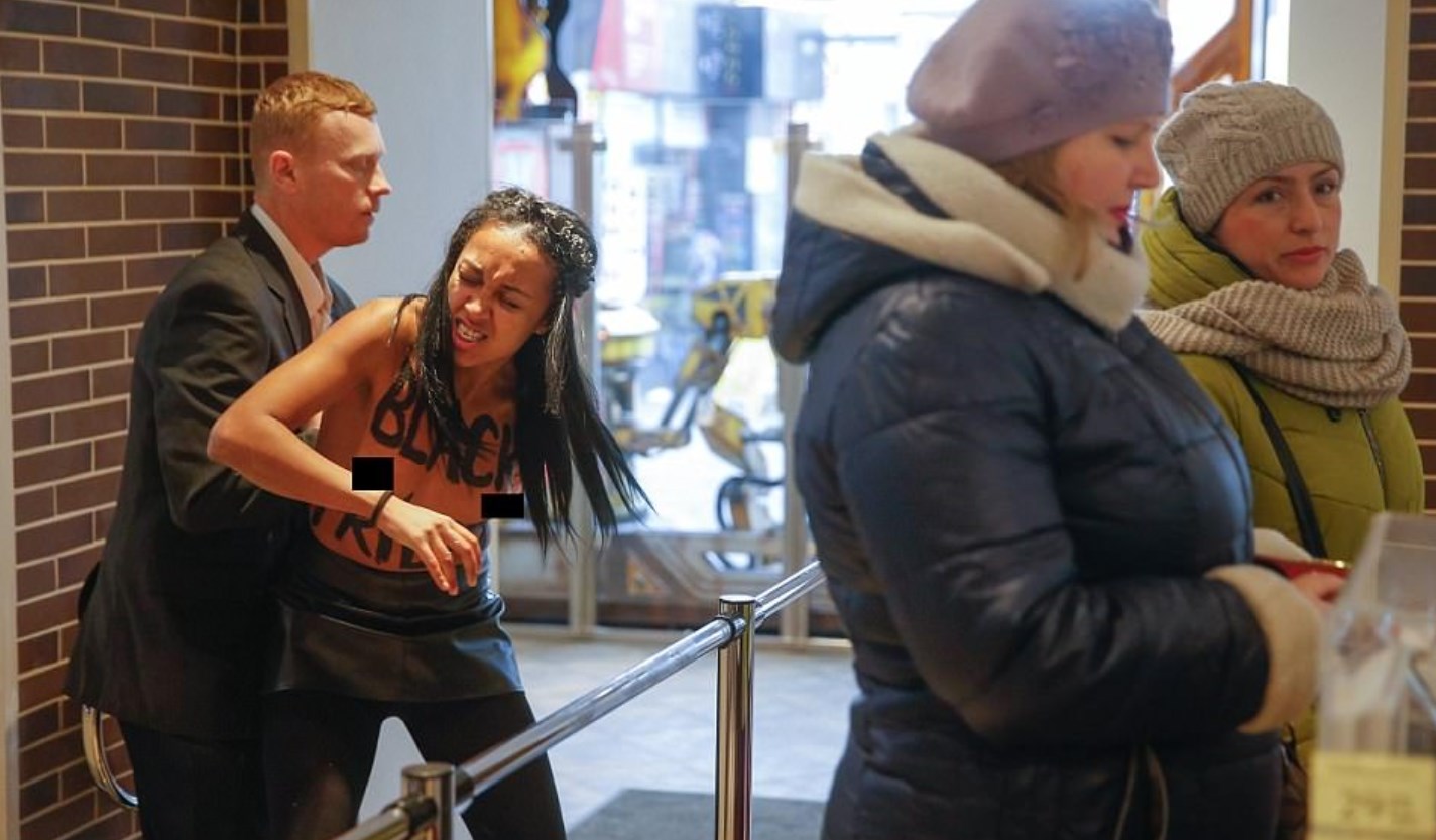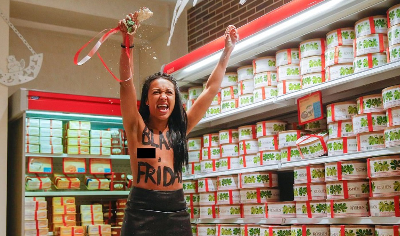 Μέλη της οργάνωσης «Femen» διαδήλωσαν γυμνόστηθες σε εμπορικό κέντρο στο Κίεβο. Παίρνοντας αφορμή από τον θεσμό της «Black Friday» που άρχισε να κάνει την εμφάνισή του και στην Ουκρανία, βρήκαν ευκαιρία να διαμαρτυρηθούν κατά του προέδρου της χώρας, Πέτρο Ποροσένκο.