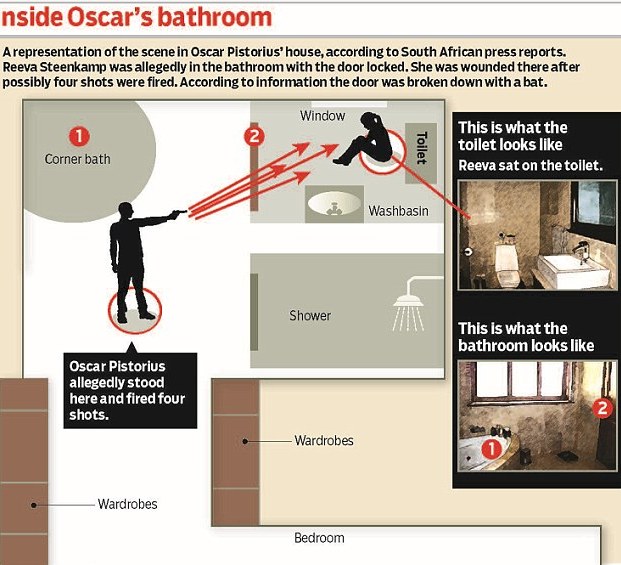 Σε ένα γραφικό που δημοσιεύει η Daily Mail, απεικονίζεται ο χώρος του μπάνιου όπου εκτυλίχθηκε το φονικό, εκεί όπου βρισκόταν η Ρίβα και πυροβολήθηκε ύστερα από καυγά που εικάζεται πως είχε το ζευγάρι.