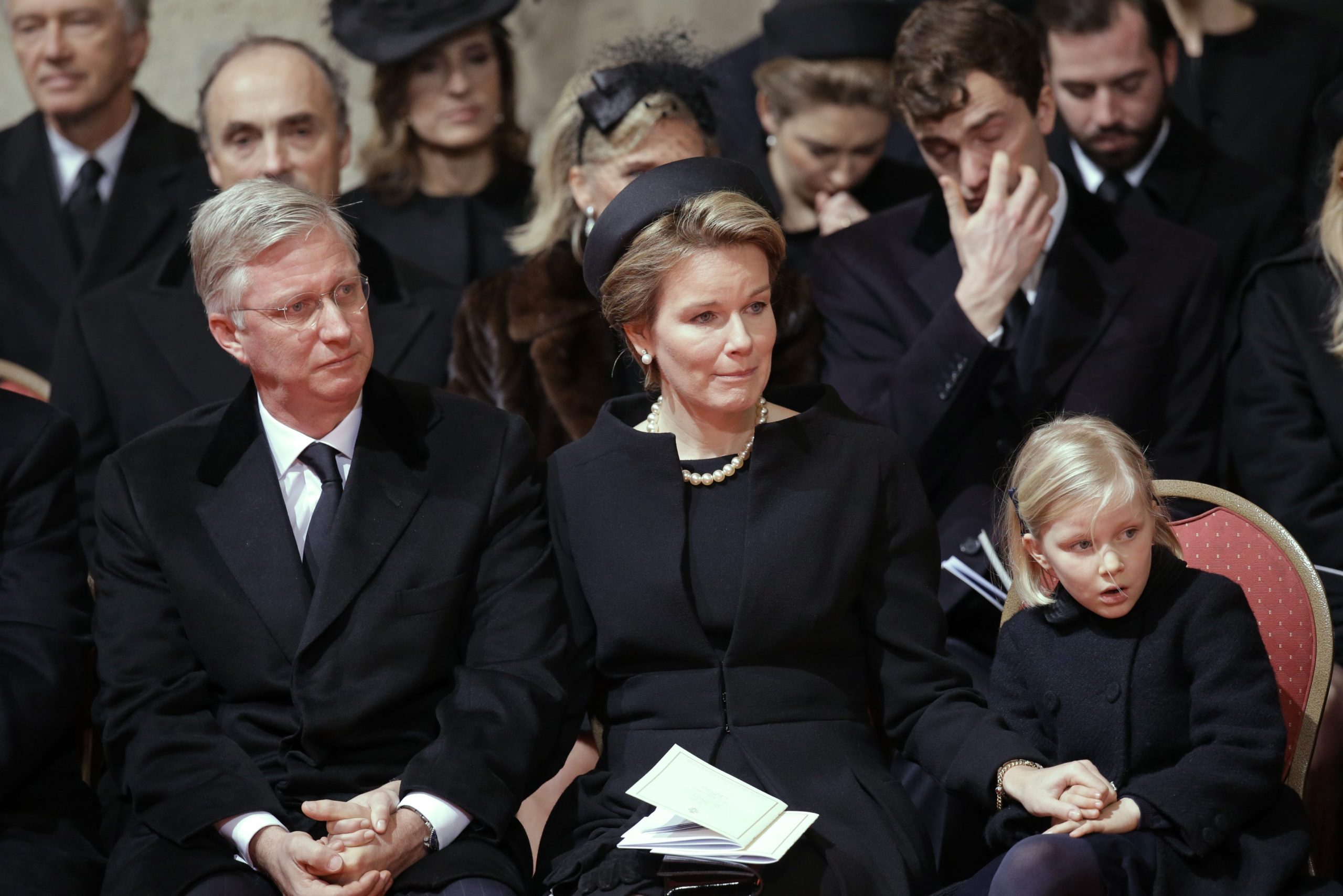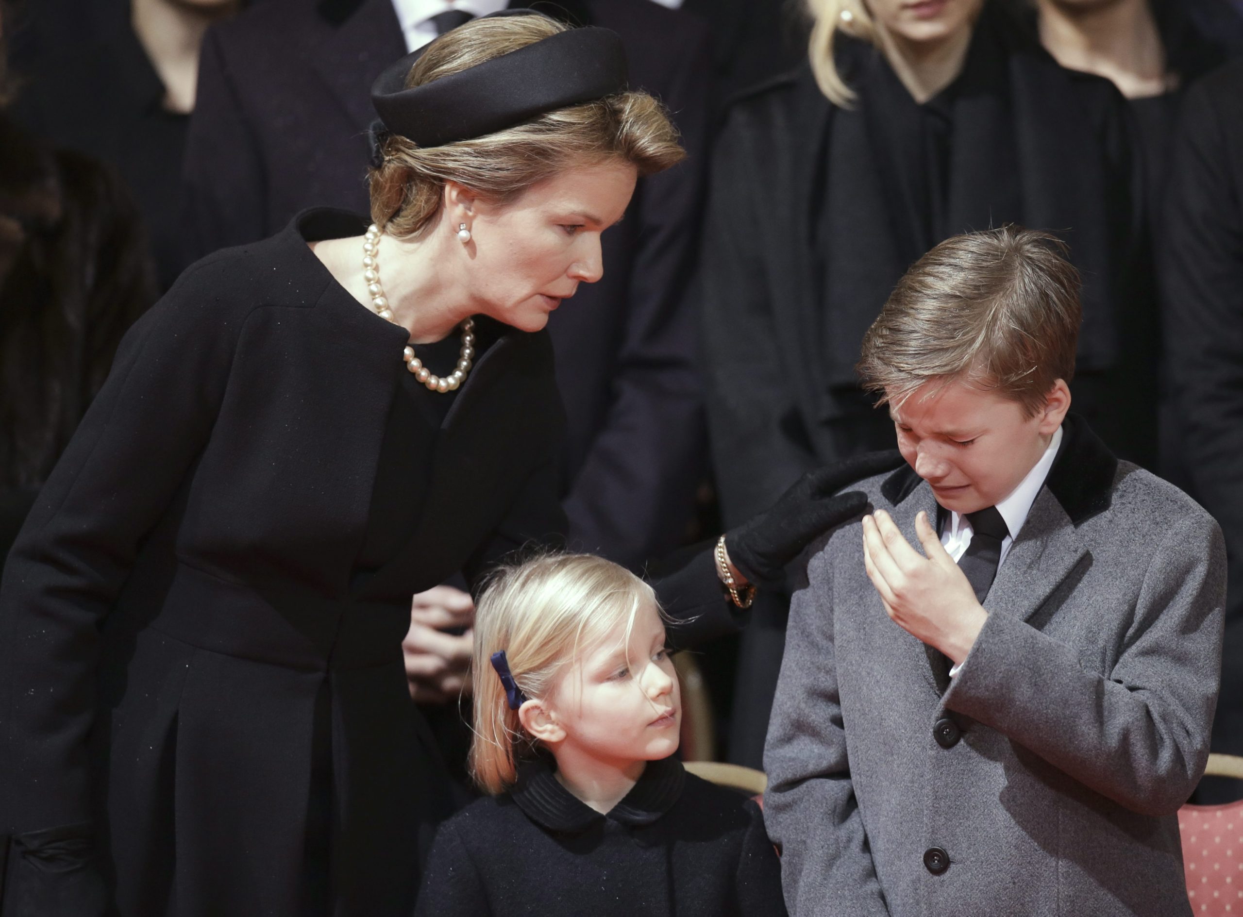 Η βασίλισσα Ματθίλδη παρηγορεί τον γιο της πρίγκιπα Γκάμπριελ και την κόρη της πριγκίπισσα Ελεονόρ κατά τη διάρκεια της νεκρώσιμης ακολουθίας.
