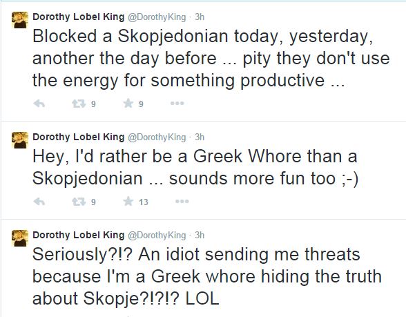 «Θα προτιμούσα να είμαι μια Ελληνίδα πόρνη παρά Σκοπιανή… Νομίζω θα ήταν πιο διασκεδαστικό», έγραψε η Ντόροθι Κινγκ στον λογαριασμό της στο Τwitter.