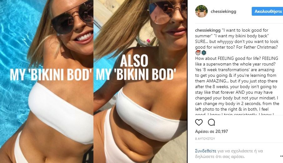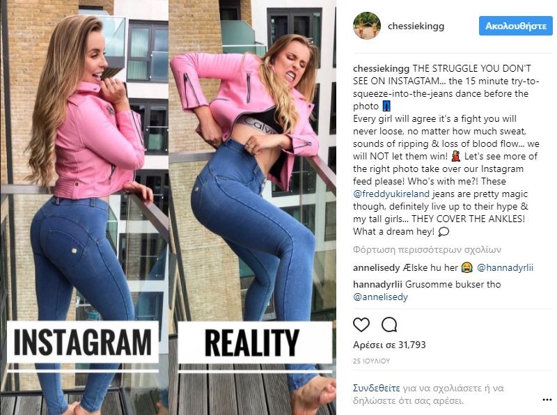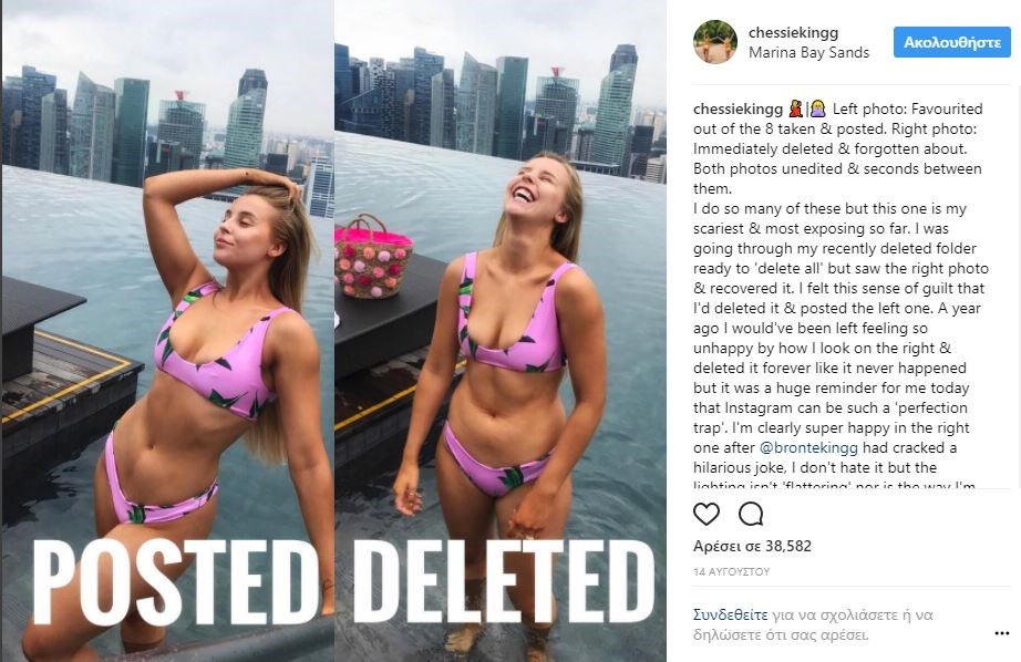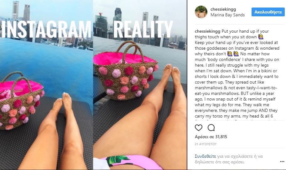 Η Τσέσι Κινγκ ανήκει σε αυτόν τον πολύ νέο και δημοφιλή κλάδο διασημότητας που ονομάζεται “social influencer” και έχει 250 χιλιάδες ακόλουθους στο Instagram. Αποφάσισε, λοιπόν, να χρησιμοποιήσει τη δύναμη που της δίνει αυτό το social medium, ώστε να απομυθοποιήσει την τέλεια εικόνα που επιλέγουν να δείχνουν γυναίκες όπως κι εκείνη, στο instagram.
