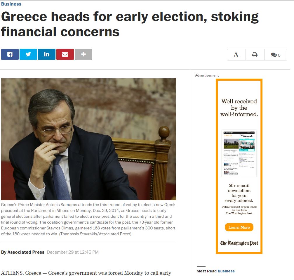 Στη συνέχεια, μεταξύ άλλων, αναφέρεται ότι «στην Ελλάδα, αυτή η εξέλιξη συμβαίνει την στιγμή που η οικονομία άρχισε να σταθεροποιείται. Τώρα όμως, με πιθανή τη νίκη του ΣΥΡΙΖΑ, κανείς δεν φαίνεται διατεθειμένος να στοιχηματίσει σε αυτή την σταθεροποίηση» και ότι «προοπτική μιας εκ νέου σύγκρουσης με τους δανειστές, έχει προκαλέσει αναταράξεις στις αγορές».