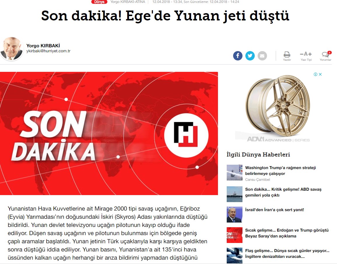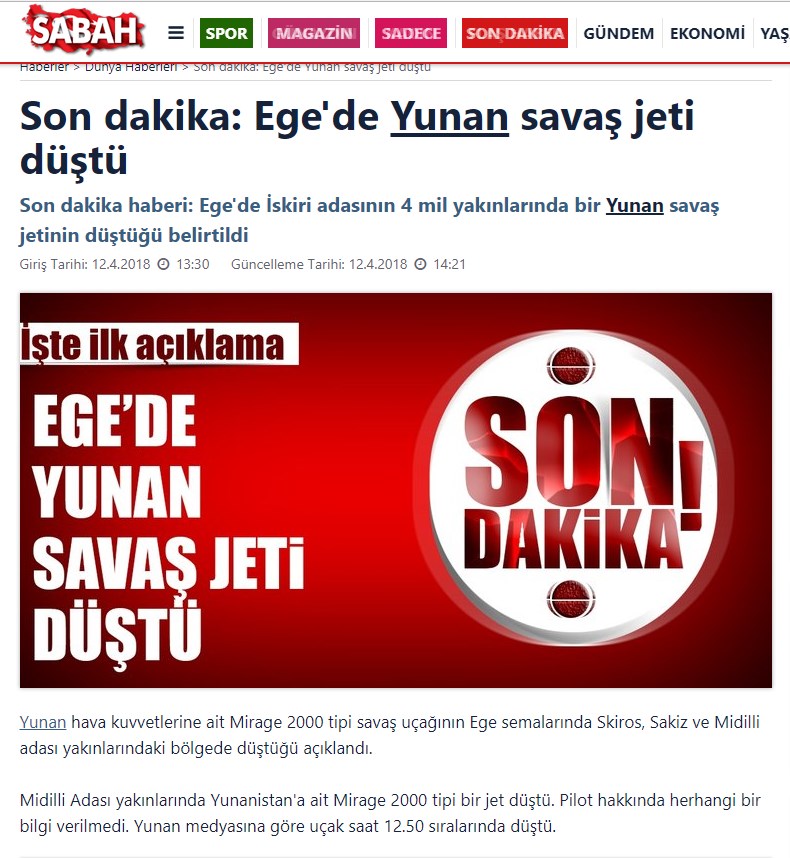Η εφημερίδα Sabah με τίτλο «Εκτακτο: Αγνοείται ελληνικό πολεμικό αεροσκάφος στο Αιγαίο» αναφέρει πως το πολεμικό αεροσκάφος τύπου τύπου Mirage 2000-5 έχει εξαφανιστεί κοντά στο νησί Σκύρο και πως ο πιλότος αγνοείται, ενώ έχουν ξεκινήσει ήδη οι έρευνες διάσωσης.