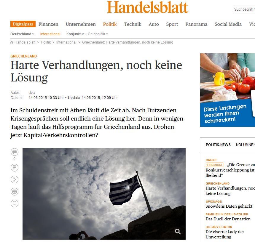 Ο χρόνος εκπνέει για την Αθήνα καθώς συνεχίζεται η διαφωνία για το χρέος, αναφέρει η Handelsblatt. Μετά από σειρά συνομιλιών για την κρίση αναζητείται επειγόντως μια λύση, καθώς σε λίγες ημέρες λήγει το τρέχον πρόγραμμα «στήριξης» για την Ελλάδα.