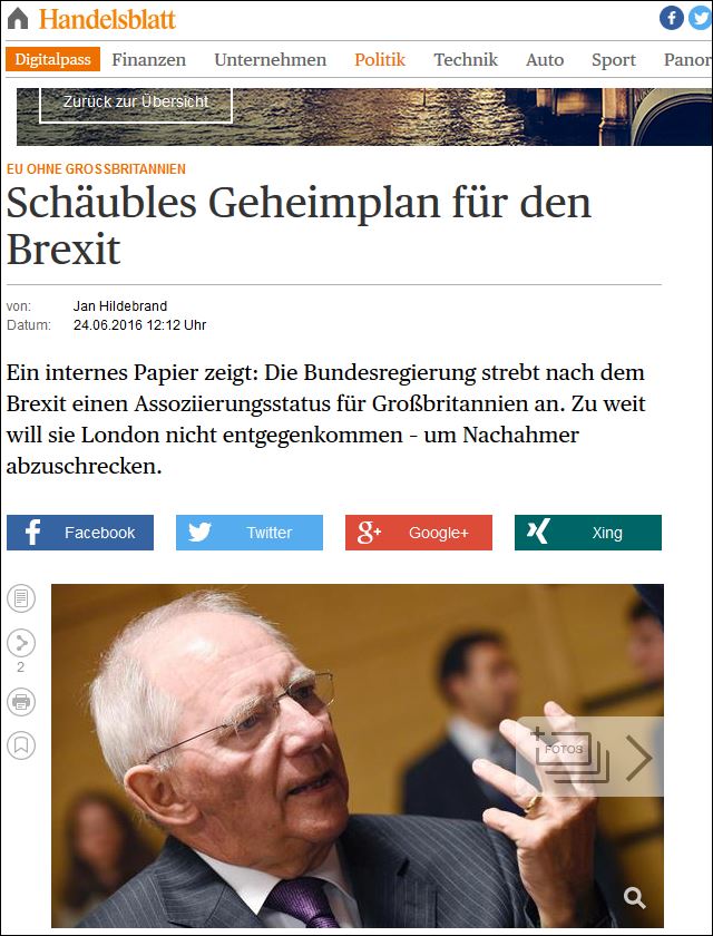 Η Handelsblatt γράφει συγκεκριμένα: «Ο Σόιμπλε ήταν προετοιμασμένος για το χειρότερο. Από τις 5 τα ξημερώματα πέντε εμπειρογνώμονες βρίσκονταν ήδη στο υπουργείο Οικονομικών και ανέλυαν το αποτέλεσμα του βρετανικού δημοψηφίσματος. Λίγη ώρα αργότερα, στο γραφείο του κατέφτασε και ο υπουργός, ο οποίος συνομίλησε τηλεφωνικά με την καγκελάριο Άνγκελα Μέρκελ, τον αντικαγκελάριο Ζίγκμαρ Γκάμπριελ και τους Ευρωπαίους συναδέλφους του.