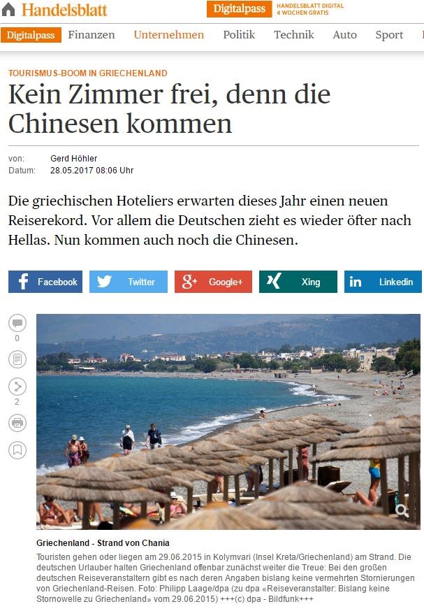 Ρεκόρ αναμένεται στον τουρισμό για φέτος στην Ελλάδα, η οποία προσελκύει ιδίως τους Γερμανούς αλλά τώρα έρχονται και οι Κινέζοι, ο οποίοι θέλουν να μετατρέψουν μάλιστα την Αθήνα σε αεροπορικό κόμβο προς τις χώρες της Ευρώπης, γράφει σε εκτεταμένο άρθρο της η έγκυρη γερμανική οικονομική εφημερίδα Handelblatt.
