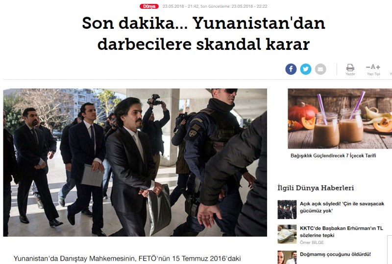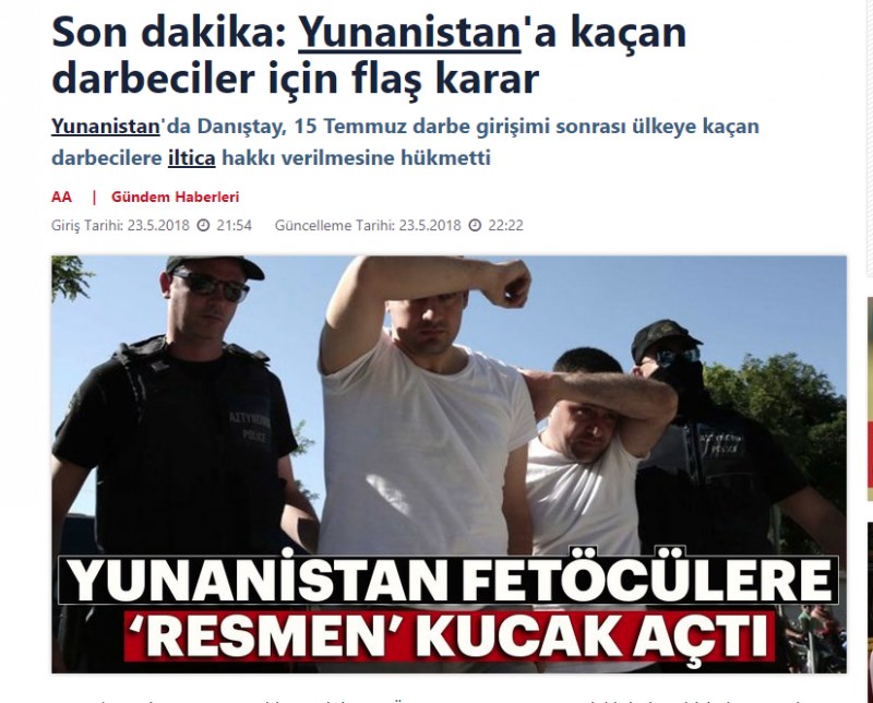 Εκτενή ρεπορτάζ για την απόφαση του ΣτΕ να χορηγήσει άσυλο σε έναν από τους οκτώ Τούρκους αξιωματικούς που κατέφθασαν με ελικόπτερο στη χώρα μας έπειτα από το αποτυχημένο πραξικόπημα του Ιουλίου του 2016, φιλοξενούν τα τουρκικά ΜΜΕ.