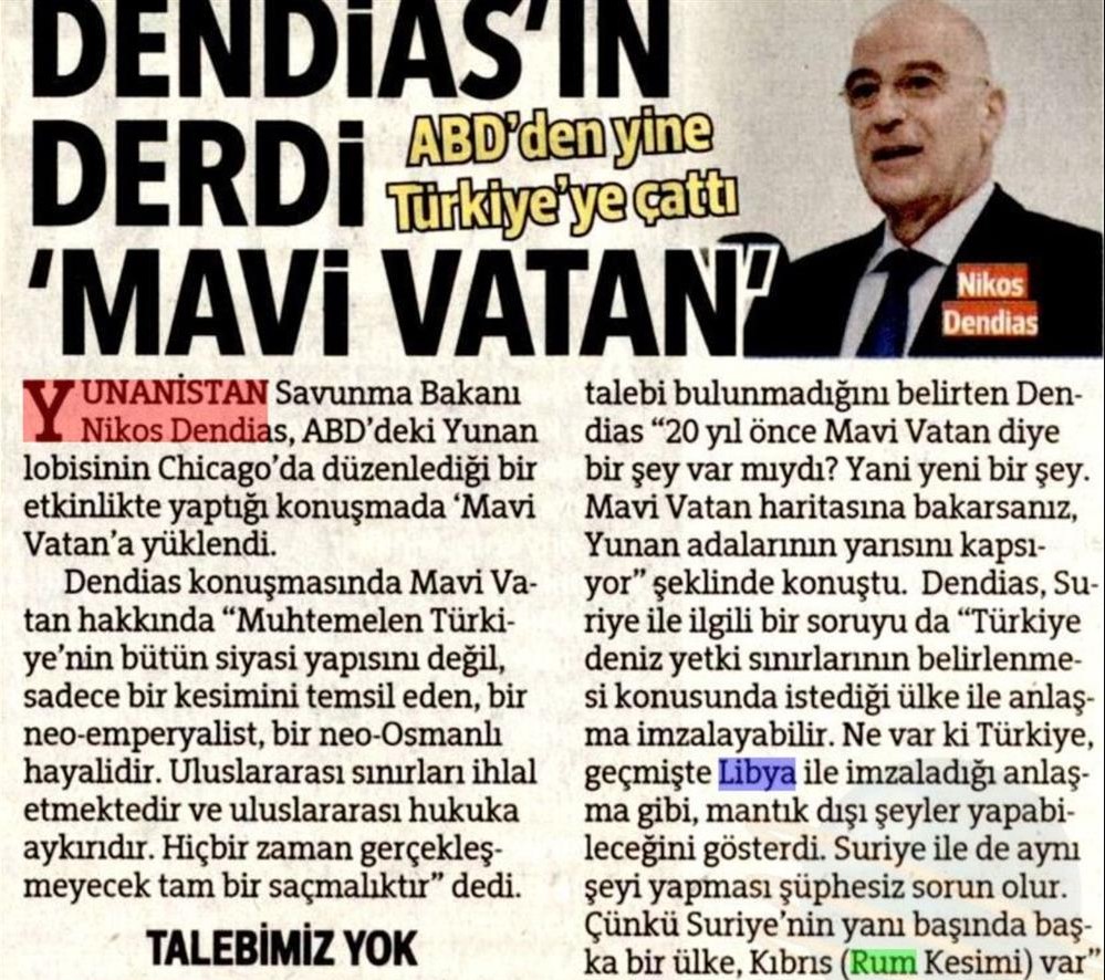 Η εφημερίδα κάνει λόγο για επίθεση του Έλληνα υπουργού Άμυνας στη «Γαλάζια Πατρίδα». «Ο Δένδιας κατά την ομιλία του είπε τα εξής: «Είναι ένα νεο-ιμπεριαλιστικό, νεο-οθωμανικό όνειρο ενός μέρους, πιθανότατα όχι του συνόλου του τουρκικού πολιτικού κατεστημένου. Παραβιάζει τα διεθνή σύνορα και είναι αντίθετο με το διεθνές δίκαιο. Είναι μια ανοησία και δεν πρόκειται να εφαρμοστεί ποτέ», ανέφερε το ρεπορτάζ της τουρκικής εφημερίδας.