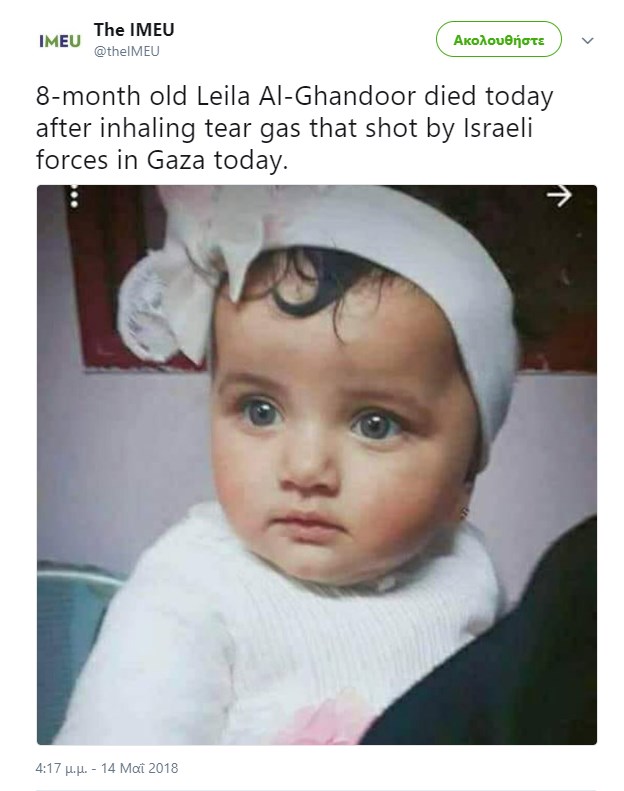 Η μόλις 8 μηνών Λέιλα είναι ένα από τα θύματα των χθεσινών επεισοδίων ανάμεσα σε Παλαιστίνιους διαδηλωτές και ισραηλινούς στρατιώτες στα σύνορα της Λωρίδας της Γάζας με το Ισραήλ. Το βρέφος απεβίωσε αφού εισέπνευσε δακρυγόνο.