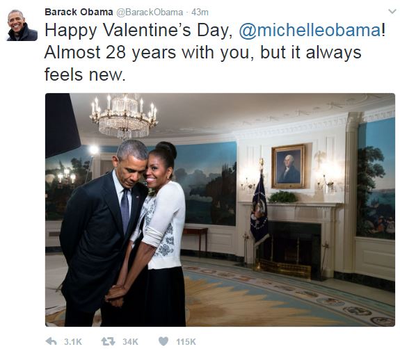 Αιώνια ερωτευμένος με την Μισέλ δηλώνει ο πρώην πρόεδρος των Ηνωμένων Πολιτειών, Μπάρακ Ομπάμα φροντίζοντας να το δείξει και στον λογαριασμό του στο Twitter ανήμερα της γιορτής του Αγίου Βαλεντίνου.