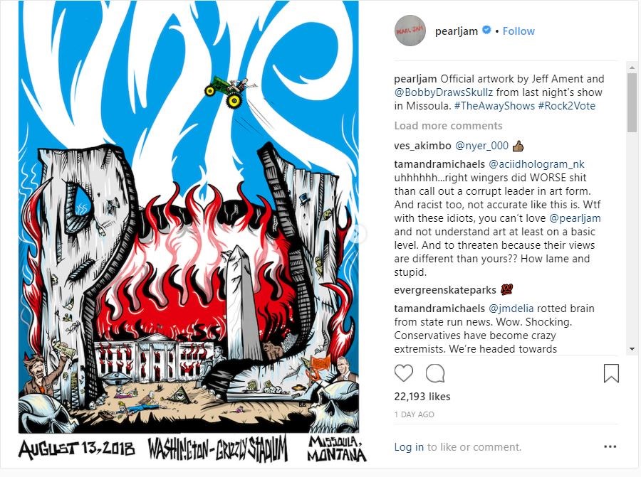 Σάλο έχει προκαλέσει η αφίσα του συγκροτήματος Pearl Jam στην οποία απεικονίζεται νεκρός ο Πρόεδρος των ΗΠΑ Ντόναλντ Τραμπ και ο Λευκός Οίκος να έχει παραδοθεί στις φλόγες.