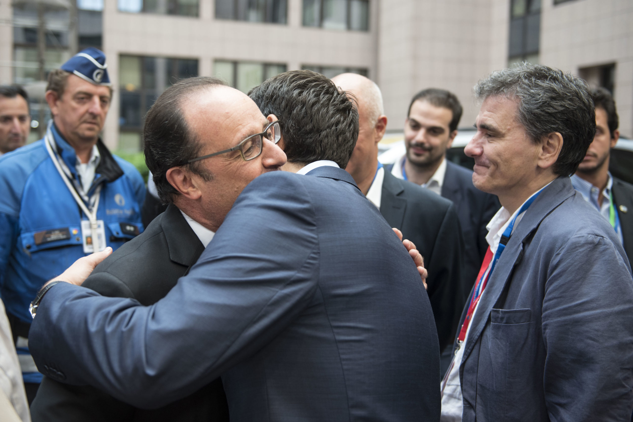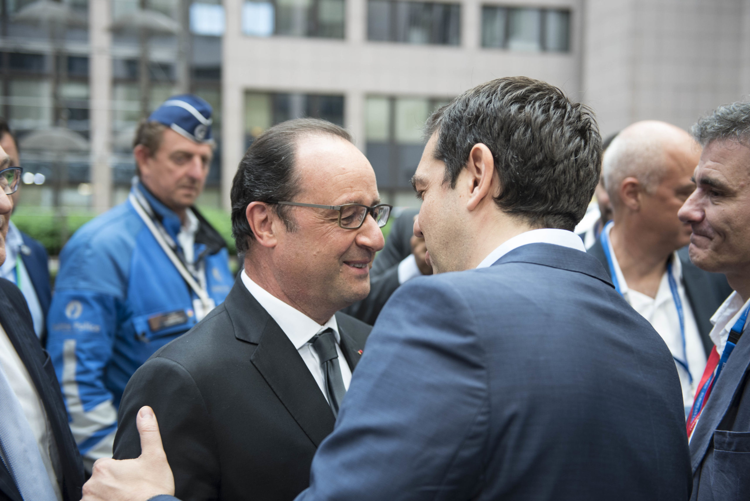 Φρανσουά Ολάντ και Αλέξης Τσίπρας συναντήθηκαν και κατά την έξοδό τους από τη Σύνοδο Κορυφής, με τον Γάλλο Πρόεδρο να αγκαλιάζει εγκάρδια των Έλληνα πρωθυπουργό…