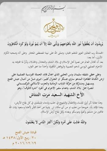Η εν λόγω οργάνωση είναι παρακλάδι της αλ Κάιντα στη Συρία και πρόσφατα είχε αλλάξει το όνομα της σε Τζαμπάτ Φατάχ αλ-Σαμ.