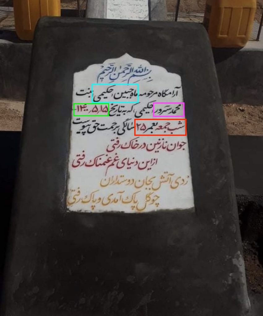 To altnews.in επικοινώνησε με μέλος της οικογένειας της, η οποία επιβεβαίωσε ότι ο θάνατός επήλθε στις 6 Αυγούστου 2021. Ο συγγενής απέστειλε φωτογραφία από την ταφόπλακα στην οποία αναγράφεται το όνομα Mahjabeen Hakimi (μπλε πλαίσιο), η ημερομηνία του θανάτου της σύμφωνα με το περσικό ημερολόγιο που είναι 15-5-1400 (πράσινο πλαίσιο), το όνομα του πατέρα της Mohammad Sarwar (ροζ πλαίσιο), και η ηλικία 25 ετών (κόκκινο πλαίσιο).