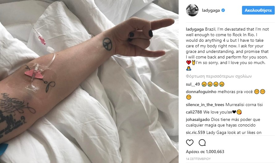 Η Lady Gaga ανακοίνωσε τον Σεπτέμβριο πως είναι αναγκασμένη να ακυρώσει όλες τις προγραμματισμένες μέχρι το τέλος της περιοδείας της συναυλίες. Η εκκεντρική ποπ σταρ, που πάσχει από ινομυαλγία, ανάρτησε στο Instagram μία φωτογραφία της μέσα από το νοσοκομείο όπου χρειάστηκε να μείνει για κάποια 24ωρα, καθώς οι πόνοι σε όλο της το σώμα ήταν ανυπόφοροι. Το σύνδρομο της ινομυαλγίας προκαλεί ισχυρό, χρόνιο πόνο στους ιστούς, όμως συνοδεύεται και από μία σειρά δευτερογενών συμπτωμάτων, όπως η κόπωση, οι διαταραχές ύπνου, η ψυχολογική δυσφορία.