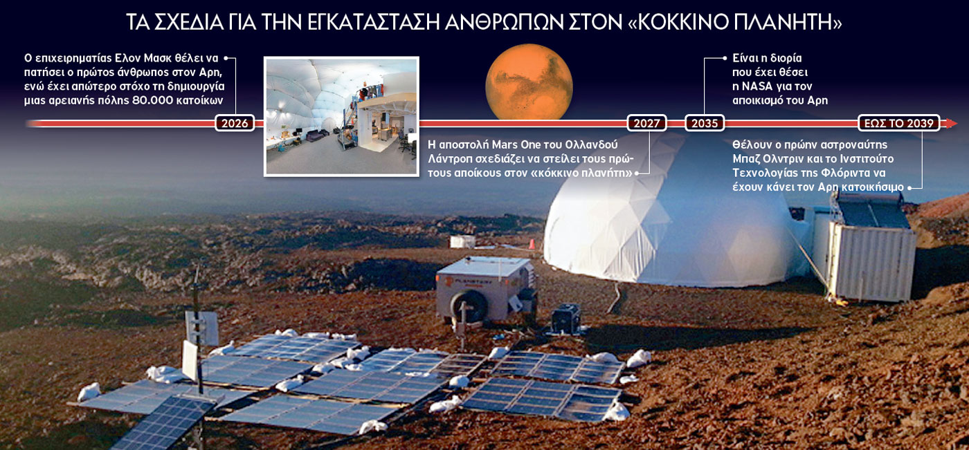 Ήδη εδώ και μερικά χρόνια έχει ξεκινήσει μια κούρσα για την κατάκτηση του Αρη, με τους ζάπλουτους «μνηστήρες» να βάζουν ο καθένας τον δικό του στόχο. Εκτός από τη NASA, η οποία έχει ήδη στείλει το ρομποτικό όχημα Curiosity και σκοπεύει να εγκαταστήσει ανθρώπους στην επιφάνεια του πλανήτη έως το 2035, είναι θερμό το ιδιωτικό ενδιαφέρον για μια εξωγήινη αποικία.