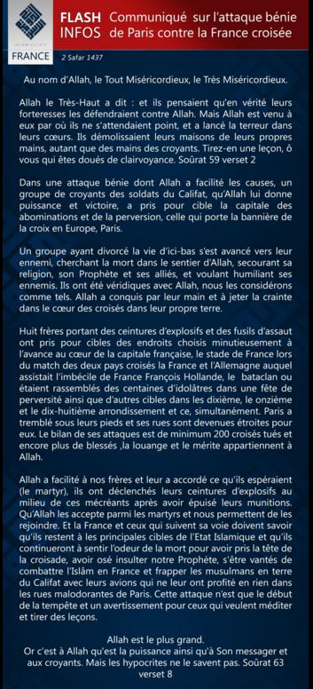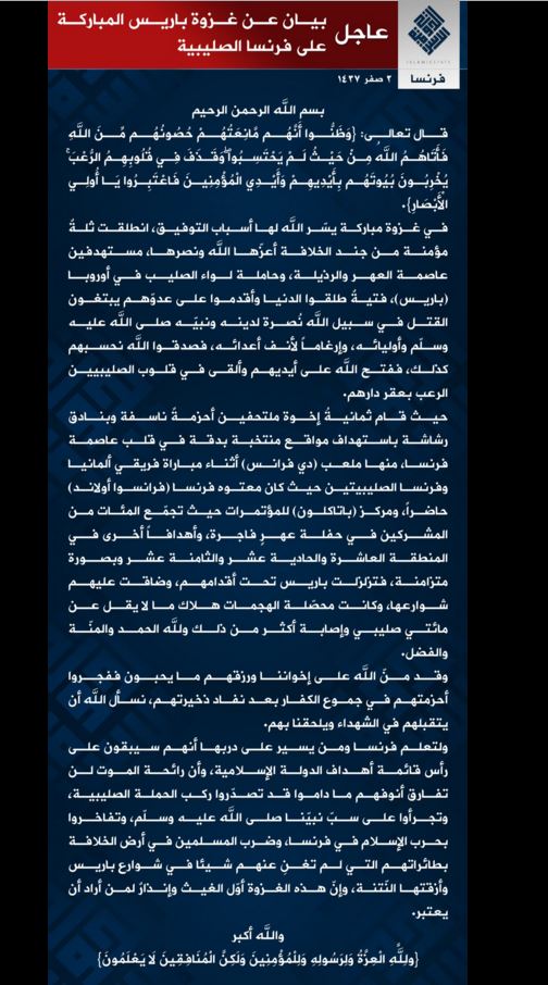 Αυτή είναι η ανακοίνωση του Ισλαμικού Κράτους για τις τρομοκρατικές επιθέσεις στο Παρίσι.
