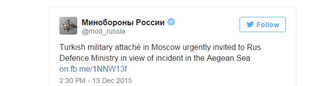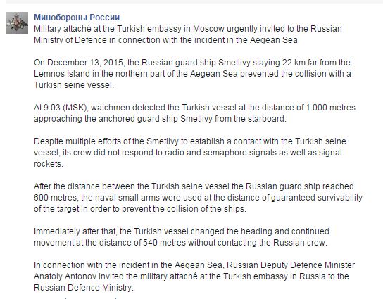 Με ανάρτησή του στα μέσα κοινωνικής δικτύωσης, Facebook και Twitter, το ρωσικό υπουργείο Άμυνας τοποθετήθηκε για το επεισόδιο μεταξύ του ρωσικού πολεμικού πλοίου εναντίον του τουρκικού ανοιχτά της Λήμνου.