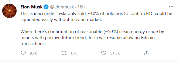 «Όταν υπάρξει επιβεβαίωση για λογική (~50%) χρήση καθαρής ενέργειας από τους μεταλλευτές (miners) με θετική μελλοντική τάση, η Tesla θα αρχίσει και πάλι να επιτρέπει τις συναλλαγές με bitcoin», ανέφερε ο Μασκ χθες σε ανάρτησή του στο Twitter.