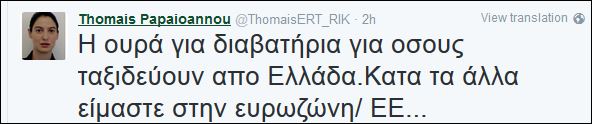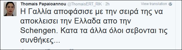 Μέσω του Twitter η ανταποκρίτρια της ΕΡΤ στο Παρίσι Θωμαΐς Παπαϊωάννου καταγγέλλει ότι η Γαλλία αποφάσισε να αποκλείσει την Ελλάδα από τη Σένγκεν. Η δημοσιογράφος επιστρέφοντας στη γαλλική πρωτεύουσα από την Αθήνα διαπίστωσε στο αεροδρόμιο ότι έπρεπε να περάσει από έλεγχο διαβατηρίων.
