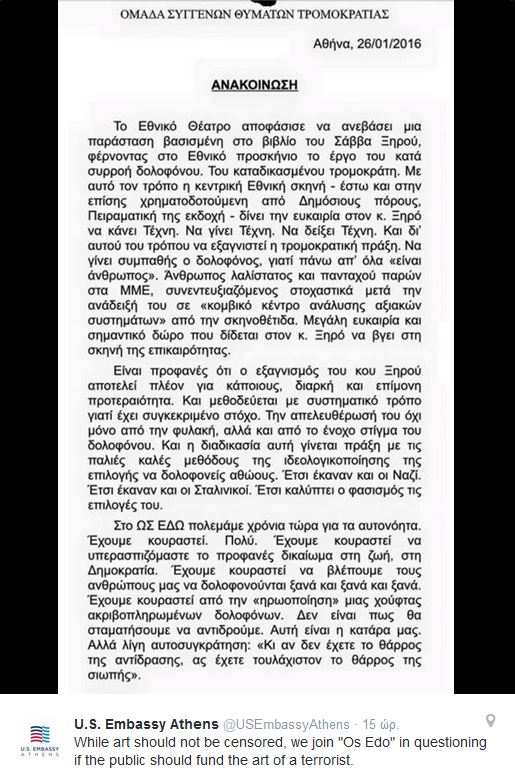 «Παρόλο που η τέχνη δεν θα πρέπει να λογοκρίνεται, συντασσόμεθα με την «Ως Εδώ» που αμφισβητεί την άποψη ότι το δημόσιο θα έπρεπε να χρηματοδοτεί την τέχνη ενός τρομοκράτη», αναφέρει σε tweet της η αμερικανική πρεσβεία στην Αθήνα.