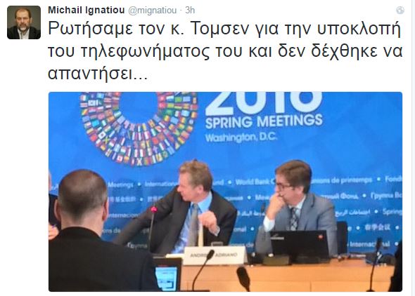 Ωστόσο, σύμφωνα με όσα έγραψε στον προσωπικό του λογαριασμό στο twitter ο ανταποκριτής του MEGA στην Ουάσιγκτον, Μιχάλης Ιγνατίου, ο Πολ Τόμσεν δεν απάντησε. Μάλιστα, όπως φαίνεται και στη φωτογραφία που ανέβασε, αμέσως μετά την ερώτηση έστρεψε το βλέμμα του αλλού.
