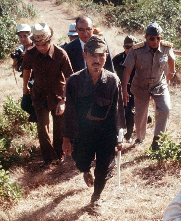 Οι φωτογραφίες δείχνουν τον Onoda καθώς βγαίνει από τη ζούγκλα, να παραδίδει το σπαθί του στον πρόεδρο των Φιλιππινών Φερδινάρδο Μάρκος αλλά και κατά την επιστροφή του στην Ιαπωνία.Πηγή: perierga.gr