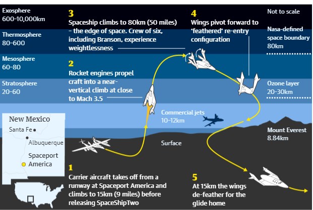 Ο Μπράνσον και η ομάδα του – δύο πιλότοι και τρεις άλλοι «ειδικοί» – θα μπουν στο διαστημικό σκάφος, VSS Unity. Αν όλα πάνε καλά, ο Μπράνσον και οι συνεργάτες θα προωθηθούν 50 μίλια πάνω από την επιφάνεια της Γης, το σημείο που θεωρείται από τη Nasa, το τέλος της γήινης ατμόσφαιρας.