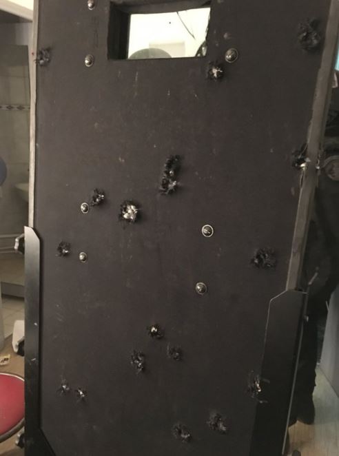 Η ασπίδα σταμάτησε 27 σφαίρες και μαρτυρά τον καταιγισμό των πυρών από τους τρομοκράτες.