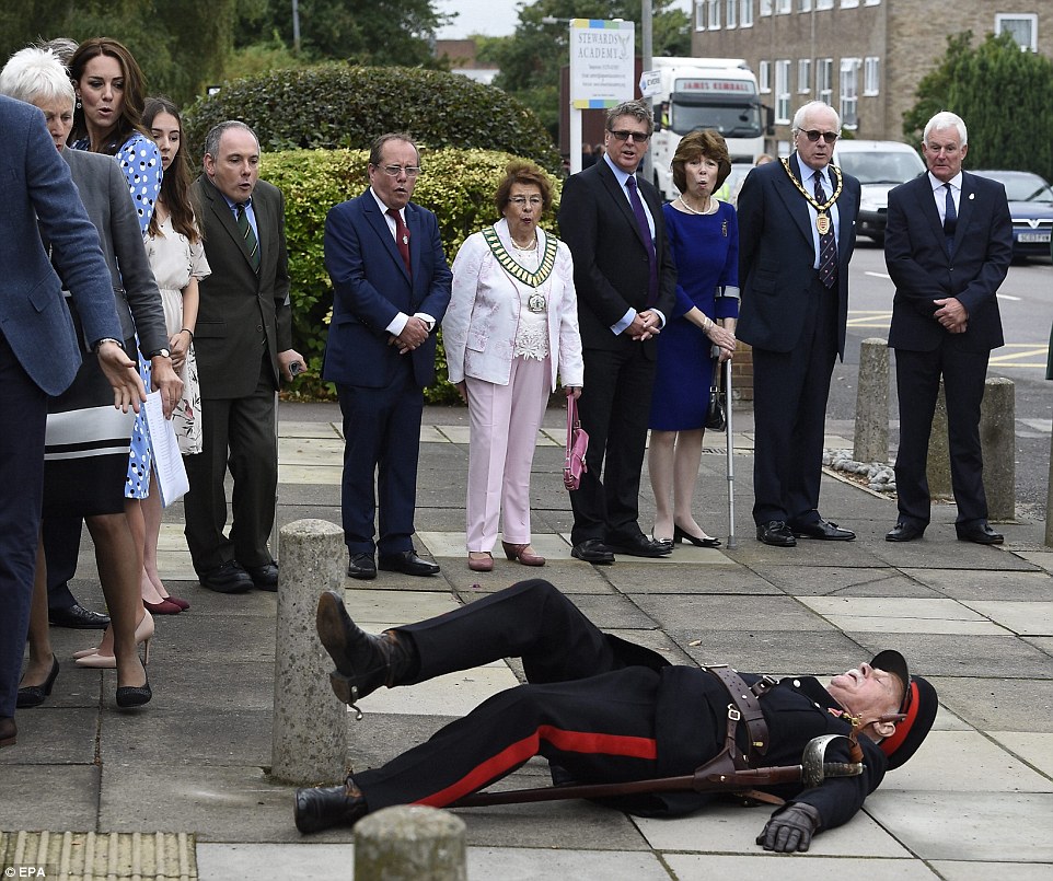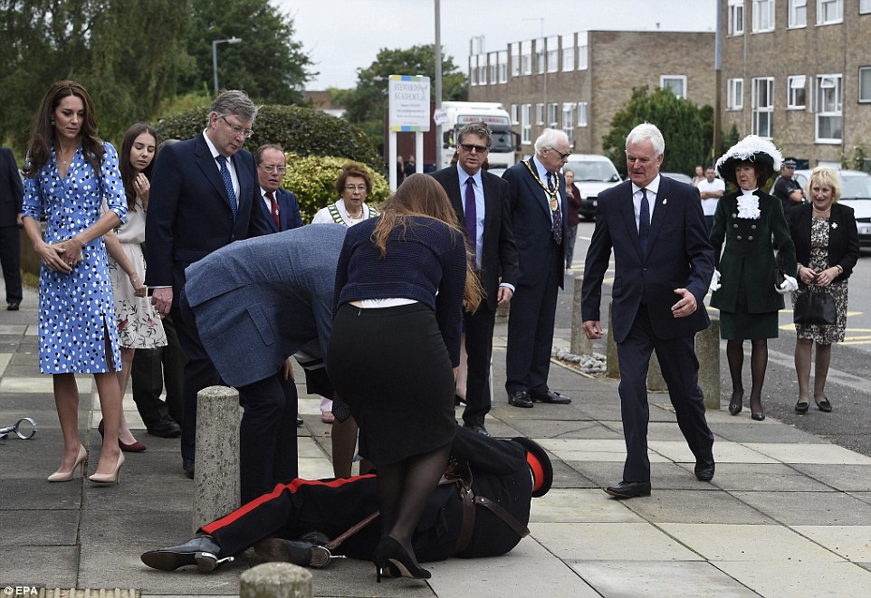 Ένα ατυχές περιστατικό σημειώθηκε κατά τη διάρκεια επίσκεψης του πρίγκιπα Γουίλιαμ και της δούκισσας του Κέιμπριτζ Κέιτ Μίντλεντον στο Έσσεξ, καθώς ένας αξιωματικός έχασε την ισορροπία του και έπεσε.