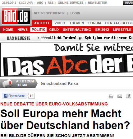 “Το νέο ερώτημα που έχει ανακύψει σχετικά με το αν η Ευρώπη θα πρέπει να έχει περισσότερη εξουσία επί της Γερμανίας ή το αντίθετο, ήρθε η ώρα να απαντηθεί” γράφει η εφημερίδα και συνεχίζει:”Ως γνωστόν, η ιδεά ενός δημοψηφίσματος σχετικά με το αν η χώρα μας θα πρέπει να έχει περισσότερη «δύναμη» στις Βρυξέλλες εχει εκφραστεί πολλές φορές. Τώρα ήρθε η ώρα να απαντήσετε”.”Το ερώτημα περιλαμβάνει τα εξής υποερωτήματα:Θα πρέπει η Ε.Ε. να έχει τον έλεγχο του εθνικού μας προϋπολογισμού;Θα πρέπει η Ε.Ε. να έχει τον έλεγχο της τραπεζική και δημοσιονομικής πολιτικής μας;Ποιες εξουσίες και σε τι βαθμό πρέπει να έχει η Ε.Ε. επί της Γερμανίας;” Στη φόρμα που ακολουθεί, στην οποία διατυπώνεται το ερώτημα “Θα πρέπει η Γερμανία να παραχωρήσει περαιτέρω εξουσίες στις Βρυξέλλες;” (το οποίο συμπεριλαμβάνει τα προαναφερθέντα υποερωτήματα) οι Γερμανοί πολίτες ψηφίζουν με ένα κλικ, “Ναι, χρειαζόμαστε περισσότερη Ευρώπη” ή “Όχι, η Ε.Ε. να παραμείνει ως έχει”:
